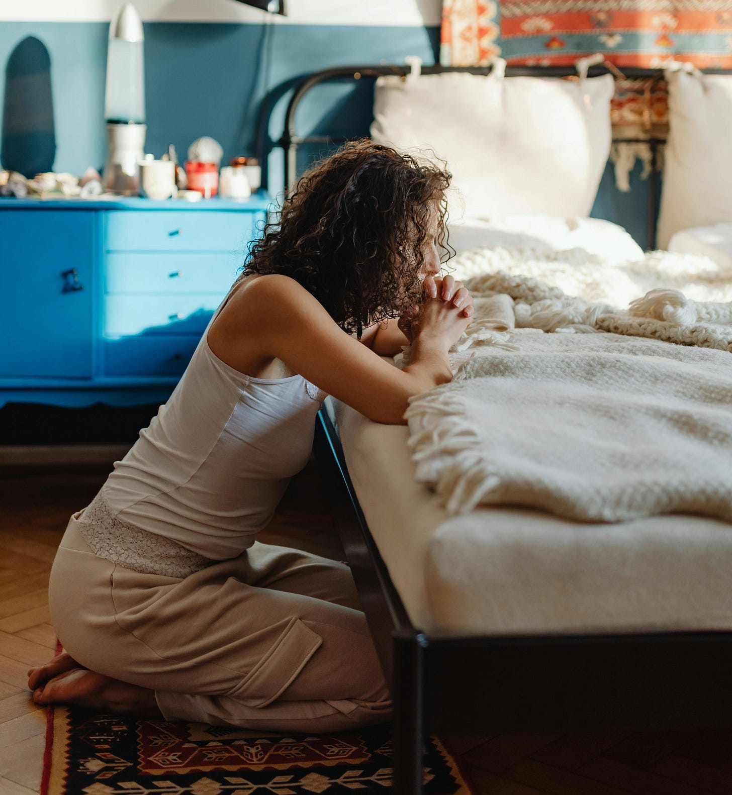 Photo By: Kaboompics.com: https://www.pexels.com/photo/a-woman-praying-by-a-bed-6633849/